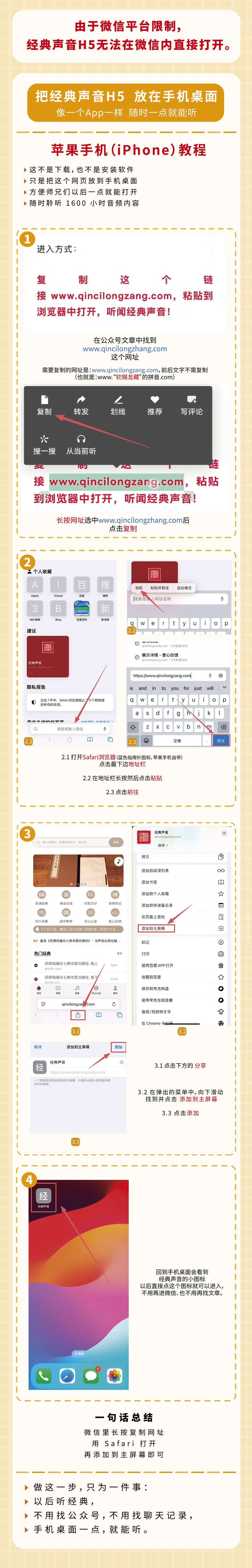 为了帮助大家获得更加便捷美好的使用体验,今天再次为大家说明一下下载到桌面的流程。(还不了解「经典声音」H5,请跳过下载流程看介绍)