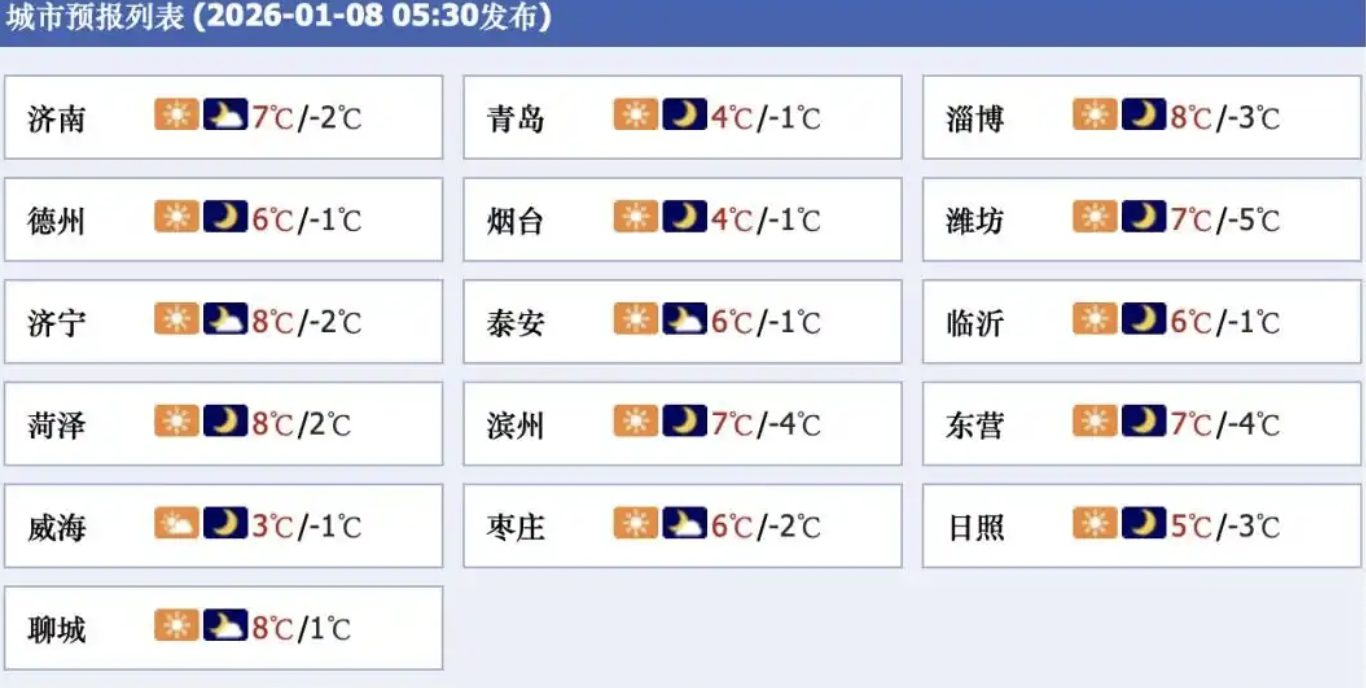 山东省气象台1月8日6时发布最新天气预报显示: